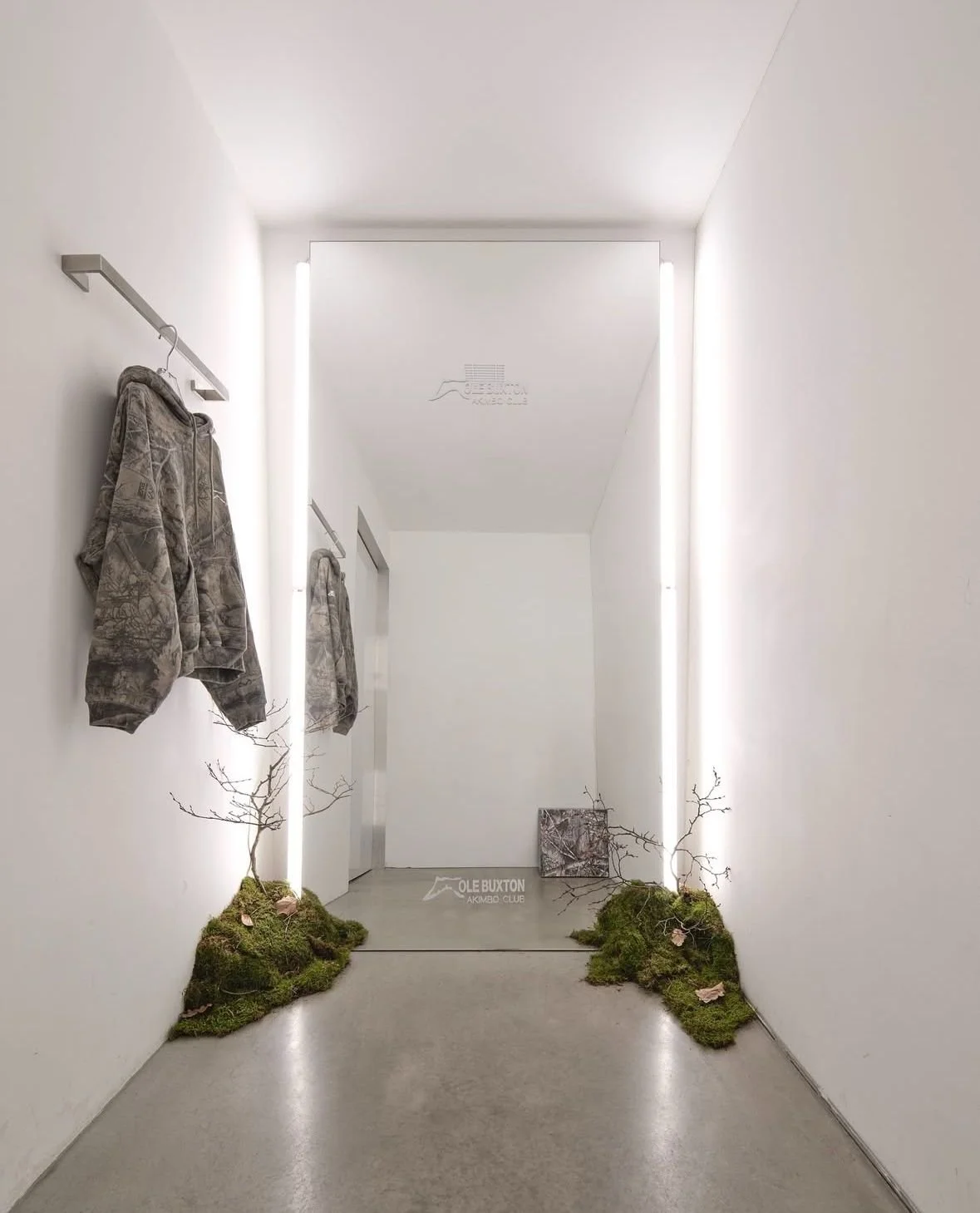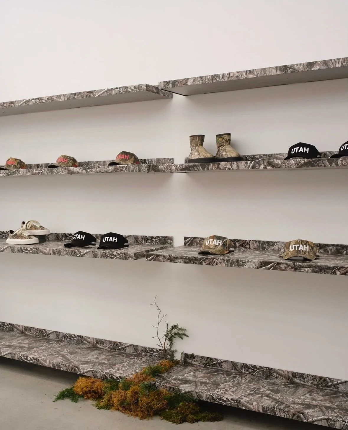 A custom greenery installation was designed and installed throughout the store, weaving natural moss and foliage into the camo landscape to introduce organic contrast and depth — grounding the industrial design language with a sense of authenticity and tactility.